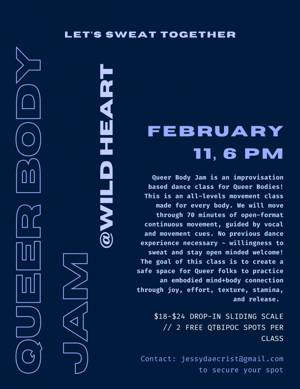 Queer Body Jam is an improvisation based, dance class for Queer bodies. This is an all-levels movement class made for every body. We will move through 60 minutes of open-format continuous movement, guided by vocal and movement cues. No previous dance experience necessary – willingness to sweat and stay open minded welcome! The goal of this class is to create a safe space for Queer folks to practice an embodied mind+body connection through joy, effort, texture, stamina, and release.