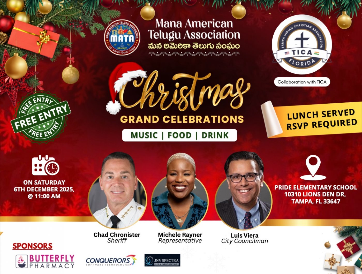 Join us for a joyful and heartwarming *Christmas Celebration* as the Mana American Telugu Association (MATA) welcomes families, friends, and our entire Tampa Bay community to come together in the spirit of love, hope, and unity.