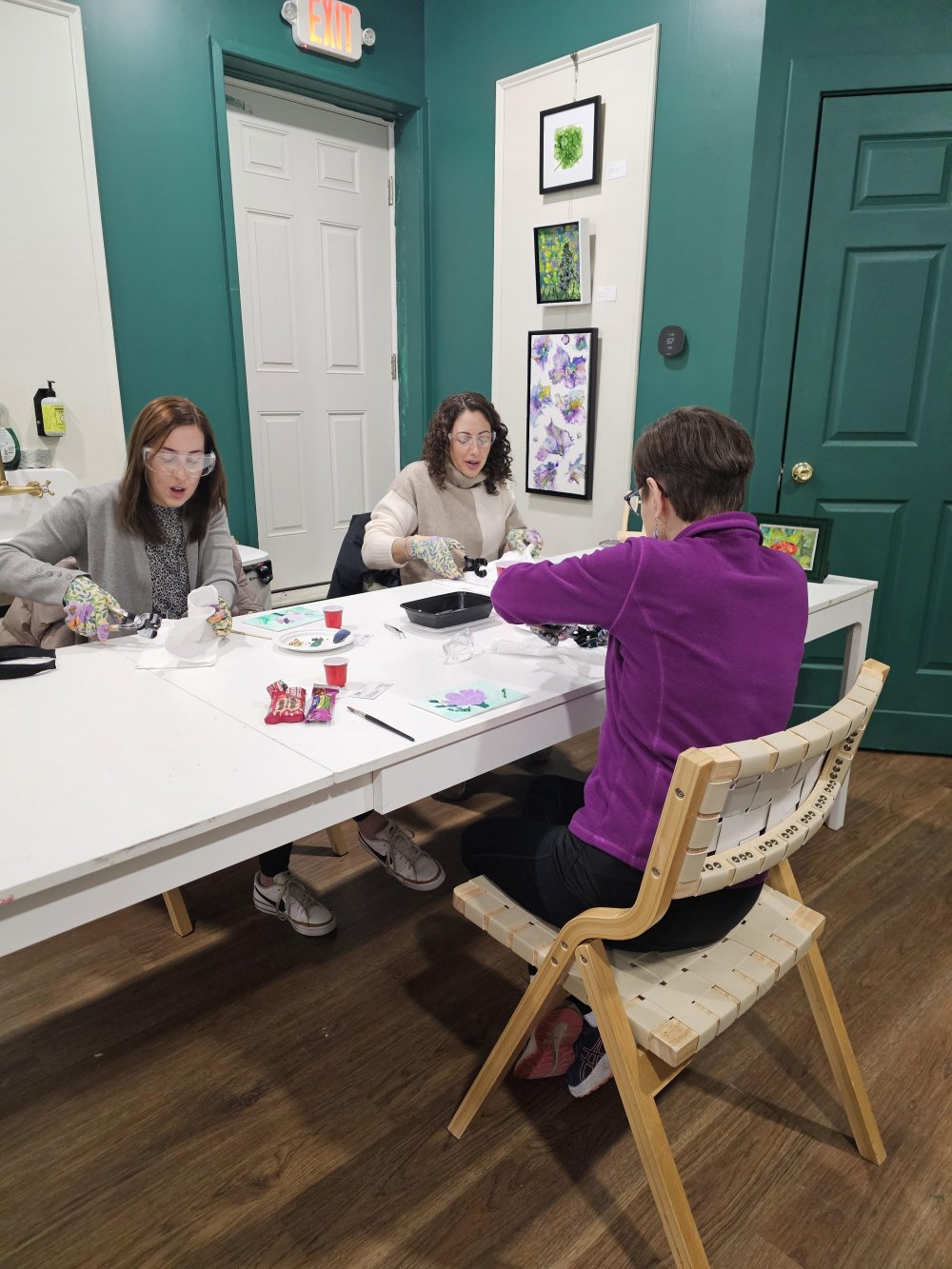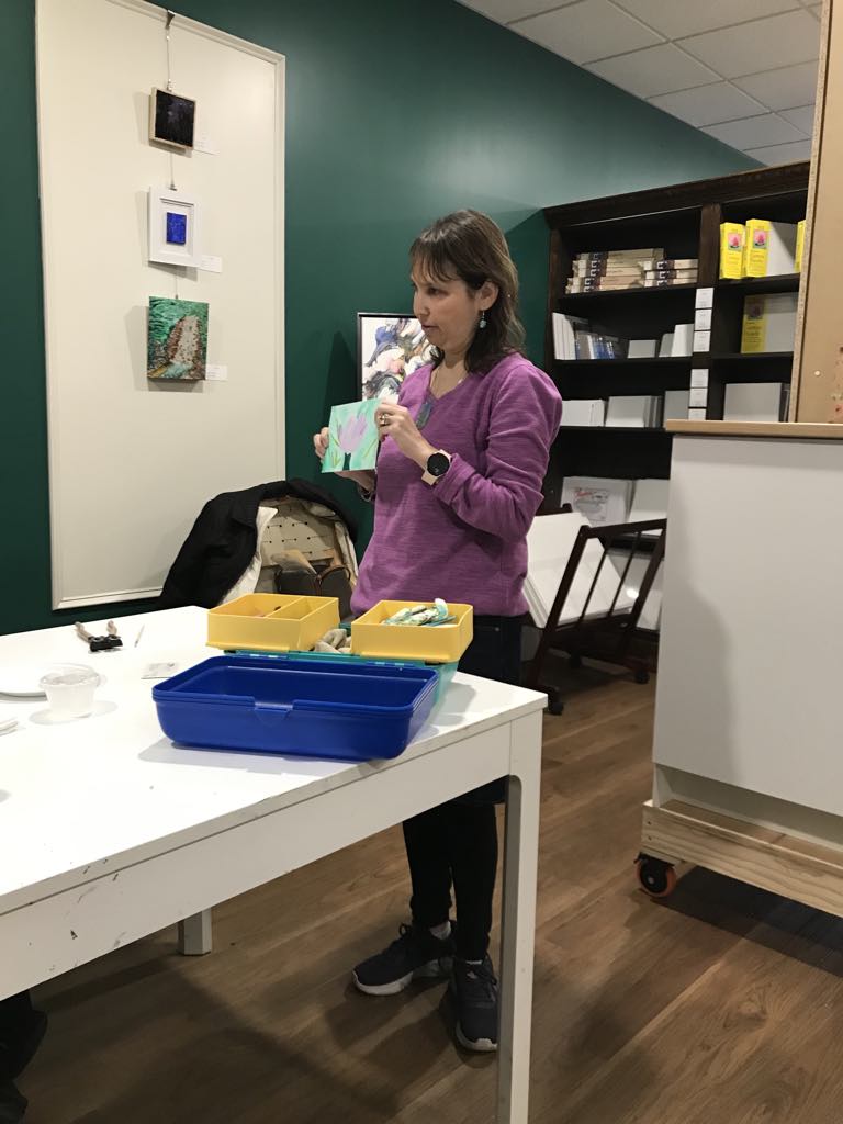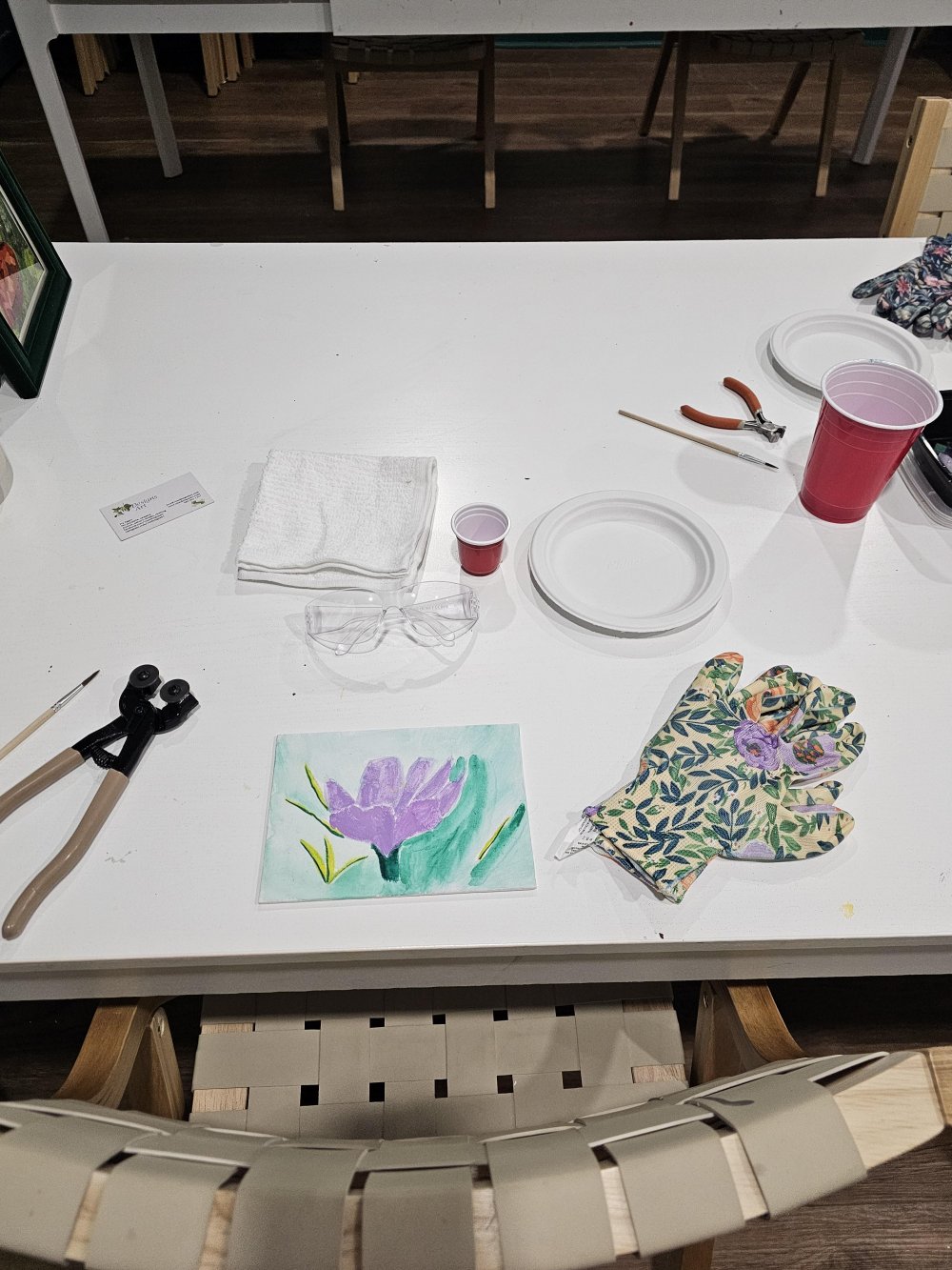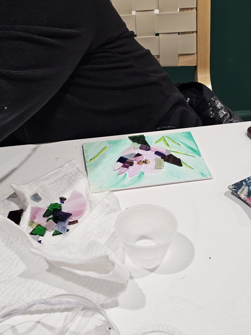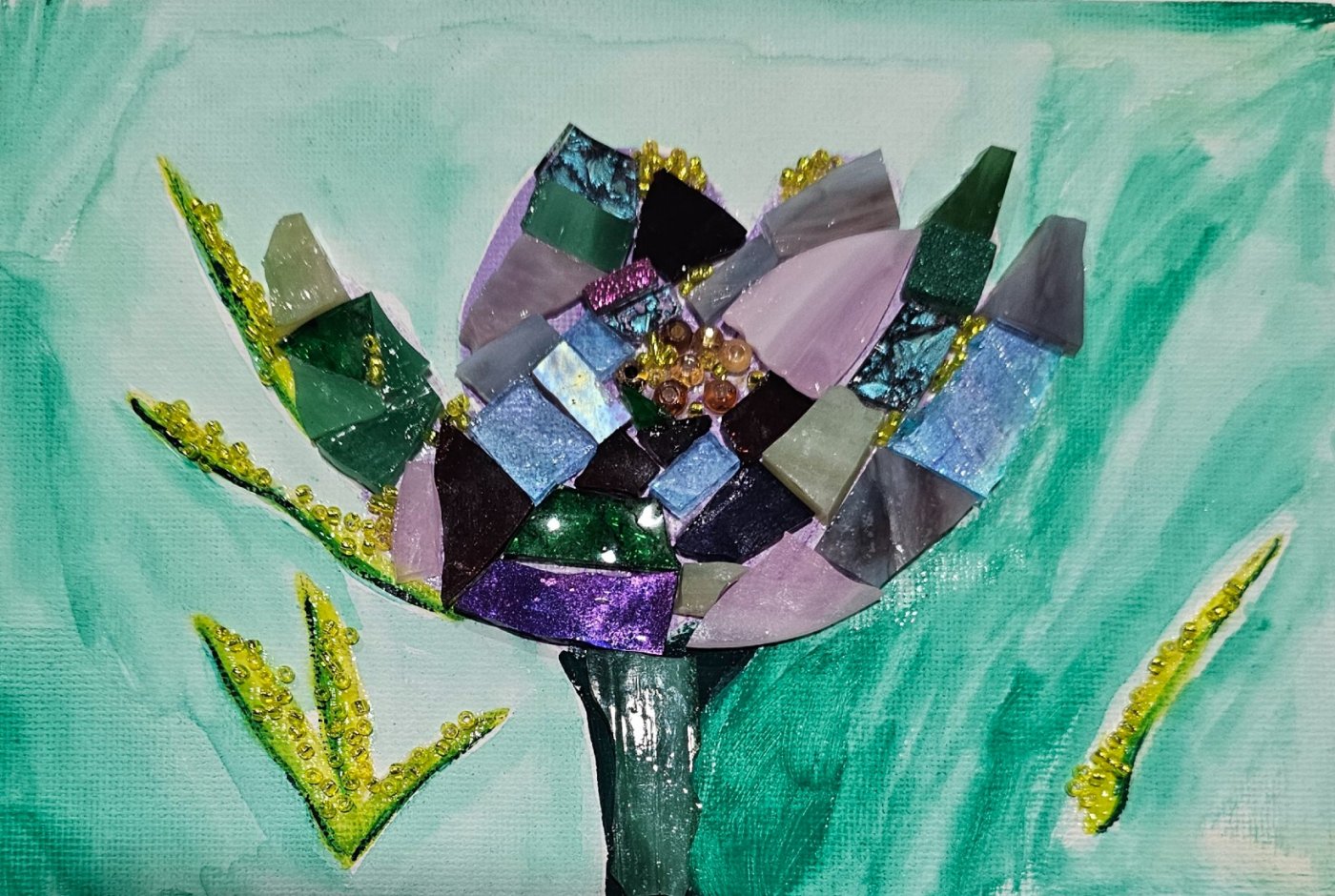 I provide all materials, including safety glasses because we will be cutting glass. You start with a pre-painted canvas panel and a variety of materials to make a sparkly one of a kind piece of artwork to take home!