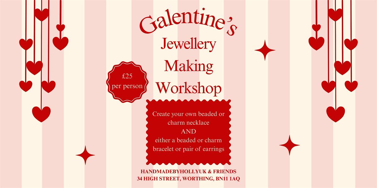 - **Event Description**: Join us at one of our Galentine's jewellery making workshops in February! Bring your friends along for an evening of fun and creativity!About this EventJewellery Making WorkshopThree dates to choose from:Friday 6th February - 5pm - 7pmFriday 13th February - 5pm - 7pmFriday 20th February - 5pm - 7pmLocation: Handmadebyhollyuk and Friends, 34 High Street, Worthing, BN11 1AQCost: £25 per person | Max group size: 6Skill Level: Beginner +Refreshments includedAll materials includedJoin us for a fun and creative jewellery making workshop! Bring your besties, you mum, your aunt or even your grandma along a relaxed girlie evening!Ideal for all skill levels, including beginners! This creative session will allow you to design and create a charm or beaded necklace and either a bracelet or pair of earrings!Relax in a welcoming atmosphere with tea, coffee and snacks provided.All materials are provided for this workshop and you’ll end up with a beautiful jewellery piece to enjoy or gift to someone else. (Max. 5 charms per necklace / bracelet, extra charms are available to purchase separately during the workshop). The workshop will run for between 1.5 hours - 2 hours depending on the complexity of the designs you wish to make.Ages 14+. Teens must be accompanied by a full paying adult.My workshops are small and intimate, meaning you get more focused support from me if you need it! This also means that spaces are limited. Book now to secure your spot for an evening of creativity! Workshops are non-refundable and non-transferable.