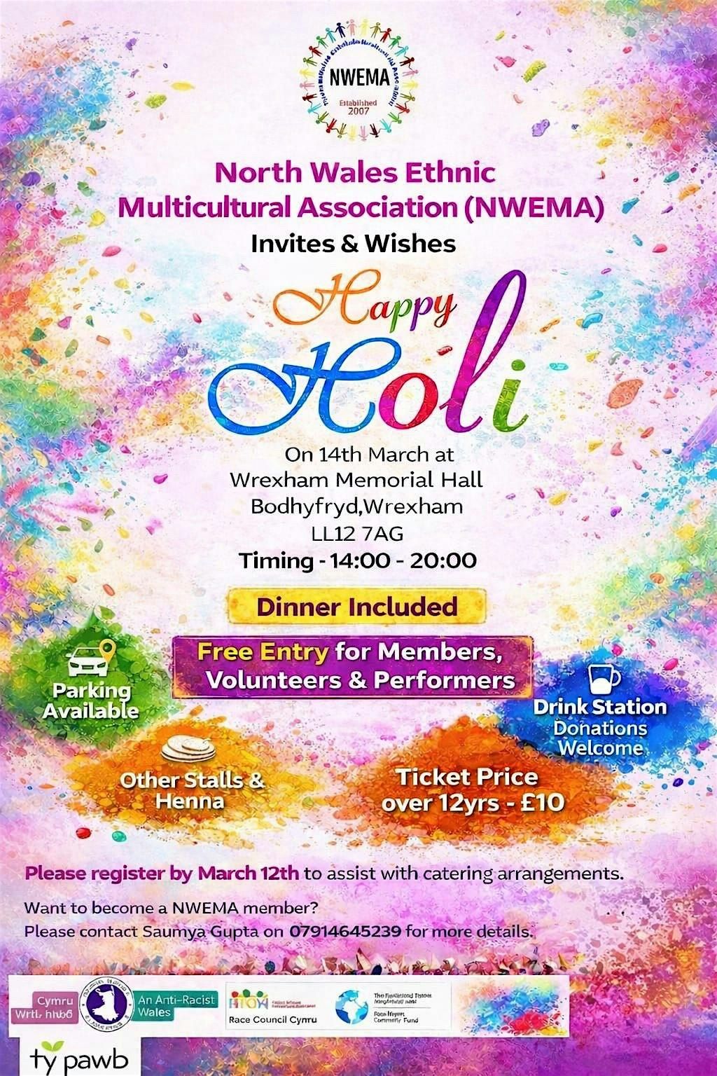 Tickets for Holi 2026 with North Wales Ethnic Multicultural Association can be booked here.